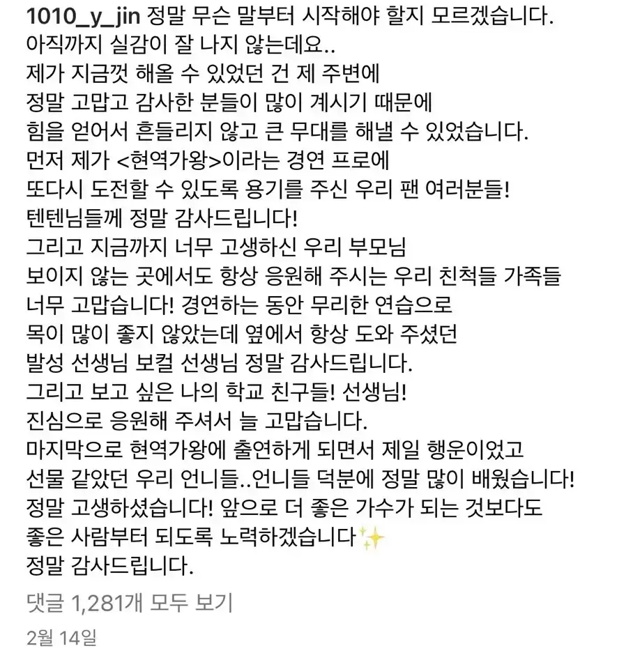 최근 방영이 끝난 현역가왕에 대한 소감을 적은 모습도 볼 수 있었는데 팬분들 애칭인 "텐텐"님들과 부모님, 친인척, 함께 출연한 출연진들에게 감사인사를 전했습니다.