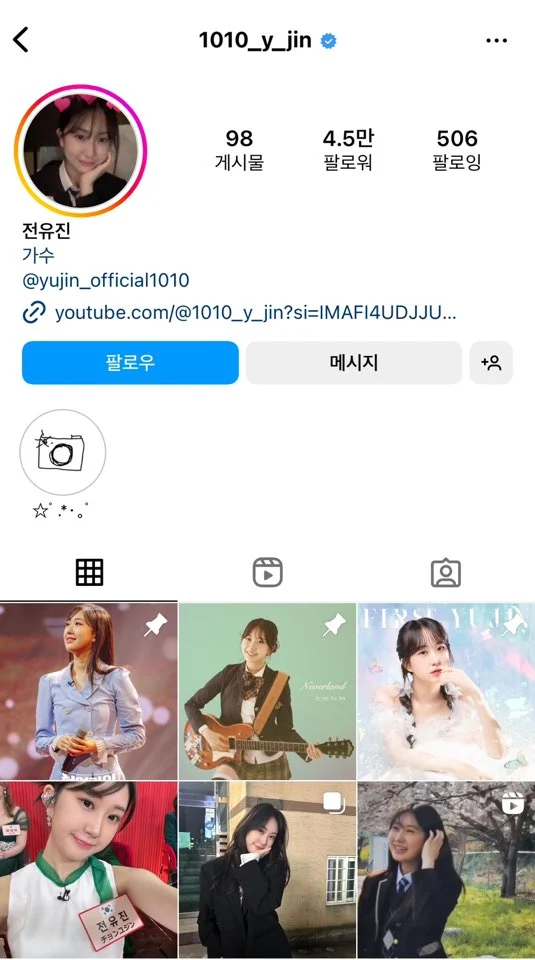 가수 전유진의 인스타그램입니다. (@1010_y_jin) 학생다운 교복 입은 모습도 볼 수 있고, 앳된 셀카도 많이 올라와 있어 가수 전유진의 일상을 함께 공유할 수 있습니다.