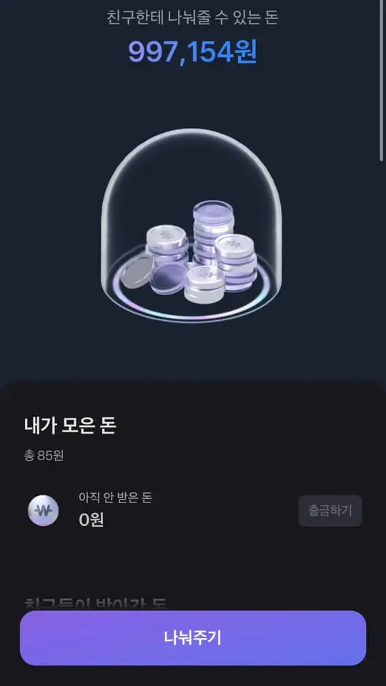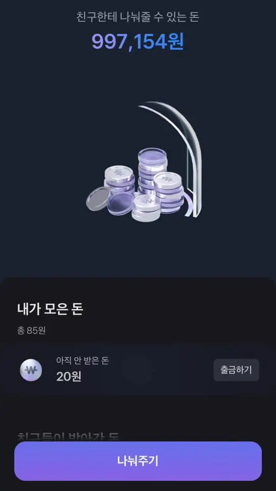 친구에게 나눠줄 수 있는 돈 즉, 토스가 나에게 배정한 금액은 총 100만 원입니다. 꽤나 큰 금액이죠? 하지만 친구 수가 최소 10만은 되지 않는 이상 이 금액을 모두 소진하기는 꽤 어려워 보입니다.
