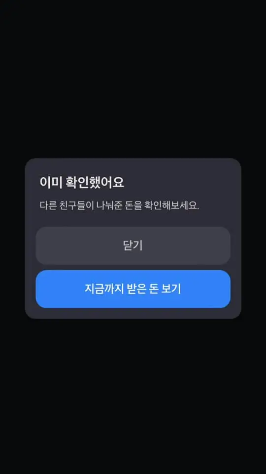 한 친구가 여러 링크를 보낼 수 있지만 받는 사람은 링크 당 1번의 기회가 열립니다. 이미 확인한 링크는 또 열어볼 수 없고, 다른 친구들이 나눠준 돈만을 확인할 수 있어요.